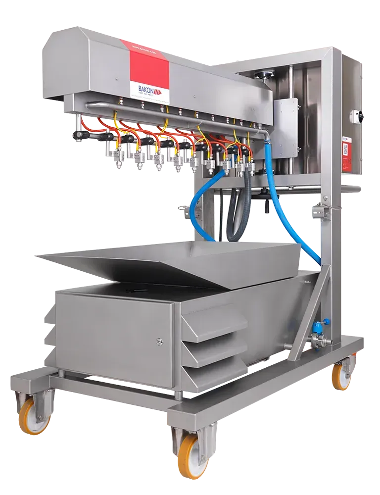 Atomizing and pulverization Dosing, pouring, filling. Transfer pumps Cake lines Ultrasonic cutting Industrial enrobers Industrial tempered pots Tartlets Whipped cream